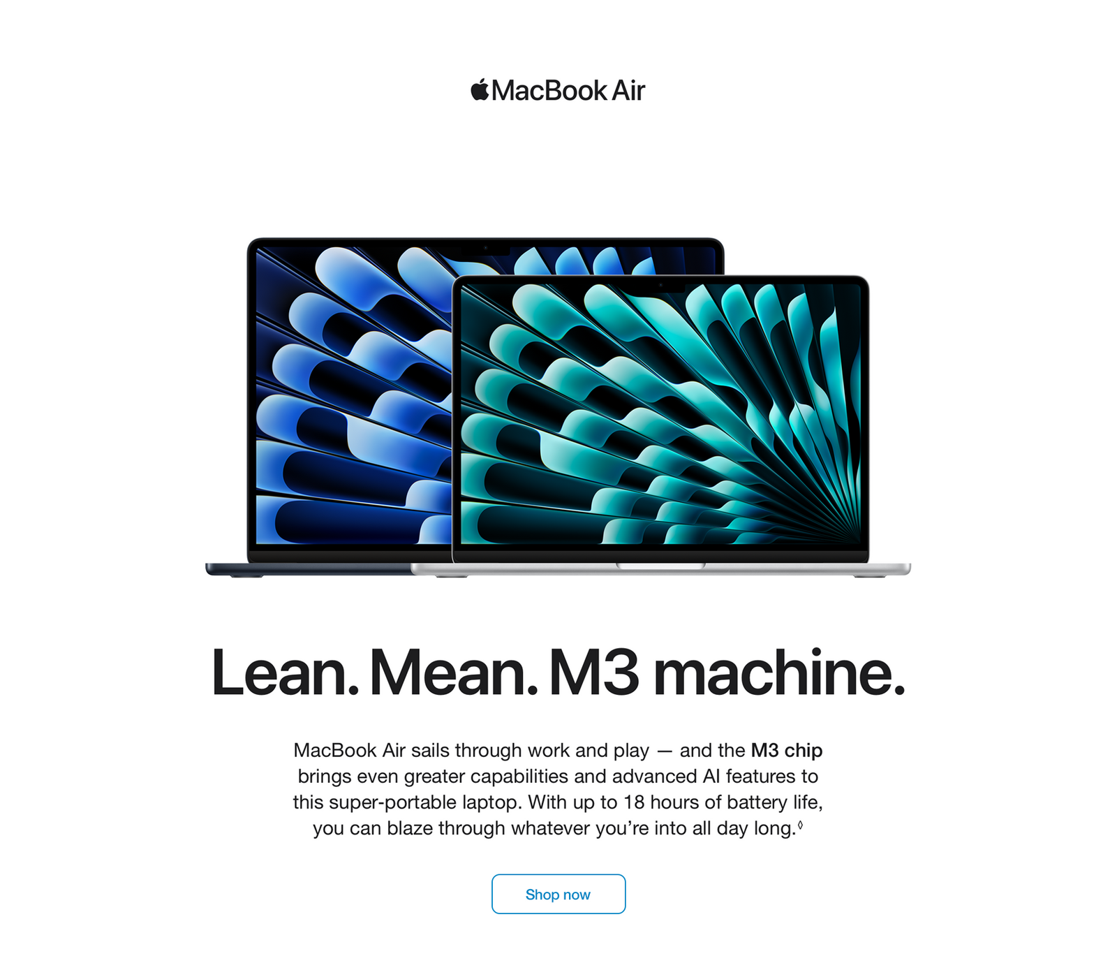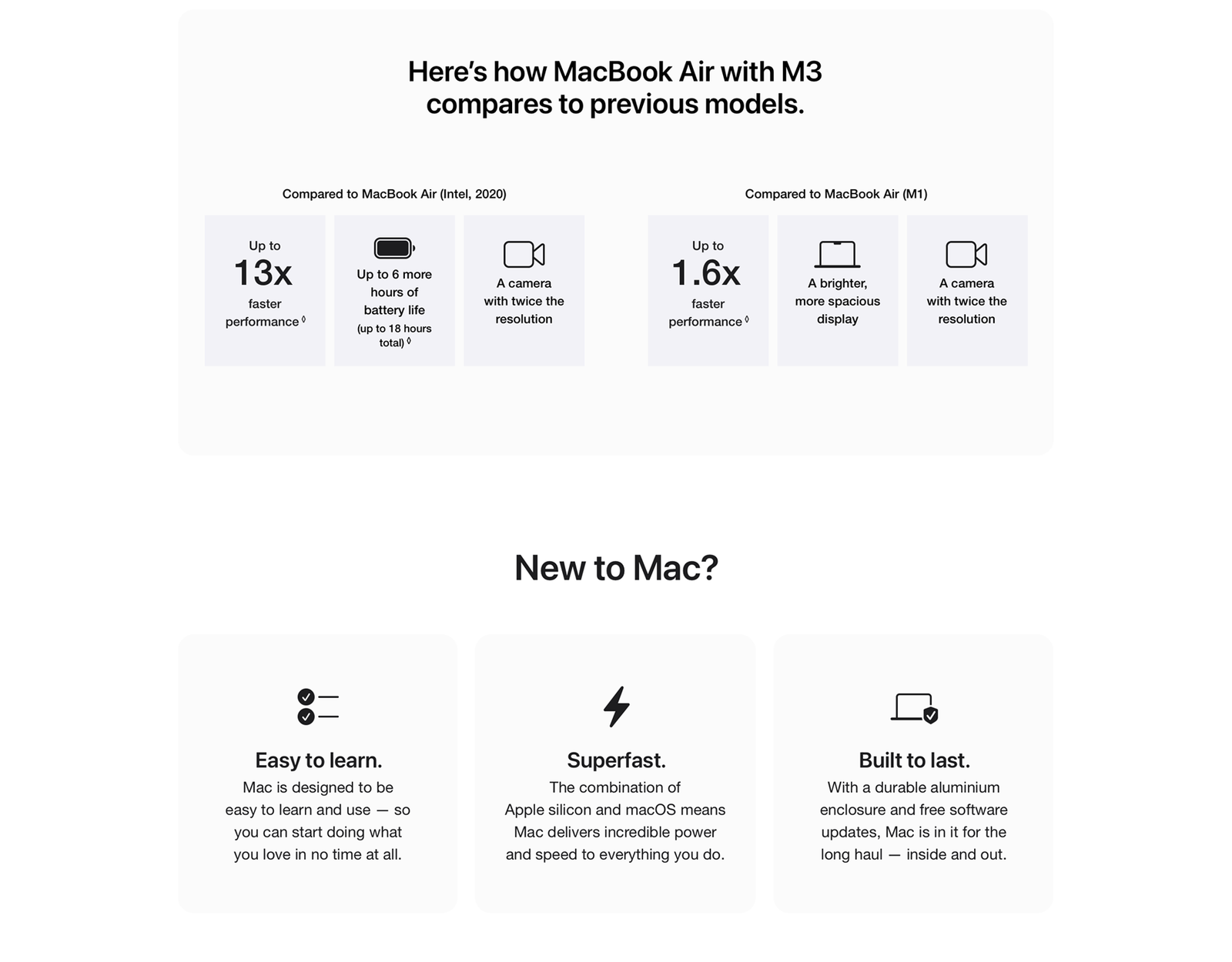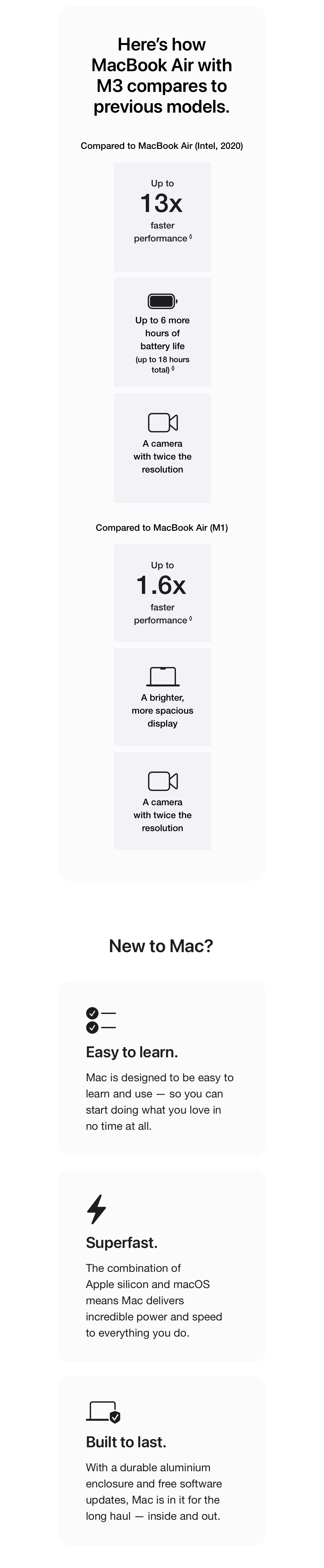 MacBook Air (M3) Performance Compared to Intel‑Based MacBook Air (2020): Results are compared to previous‑generation 1.2GHz quad‑core Intel Core i7–based MacBook Air systems with Intel Iris Plus Graphics, 16GB of RAM and 2TB SSD.