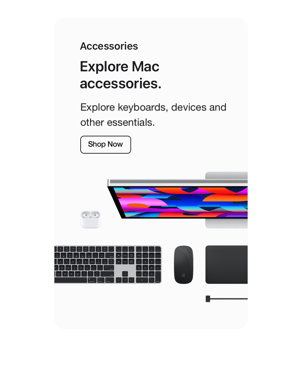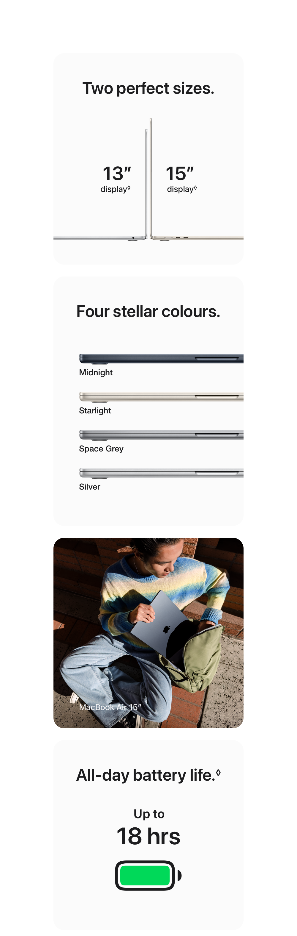 Display: Screen size is measured diagonally. Actual diagonal screen size of the 24‑inch iMac is 23.5 inches. The displays on the MacBook Air with M1 chip and 13‑inch MacBook Pro measure 13.3 inches diagonally. The displays on the 13‑inch MacBook Air with M2 or M3, the 15‑inch MacBook Air, and the 14‑inch and 16‑inch MacBook Pro have rounded corners at the top. When measured as a standard rectangular shape, the screens are 13.6 inches, 15.3 inches, 14.2 inches and 16.2 inches diagonally (actual viewable area is less).