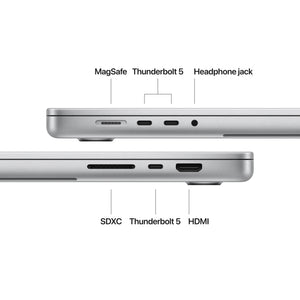CONNECT IT ALL— The 16-inch MacBook Pro features three Thunderbolt 5 ports, a MagSafe 3 charging port, SDXC card slot, HDMI port, and headphone jack. And it supports up to two external displays with M4 Pro, or up to four with M4 Max.